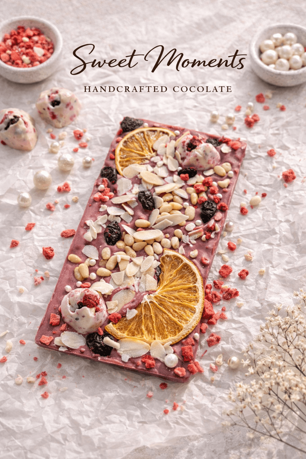 Шоколад RUBY - новый вид шоколада с натуральным рубиновым цветом и свежим фруктовым вкусом и небольшой кислинкой. А добавление декора из шоколадных конфет с ягодами, вяленых долек апельсина, вяленой сосновой шишки, ягод и орехов - делает его поистине уникальным.